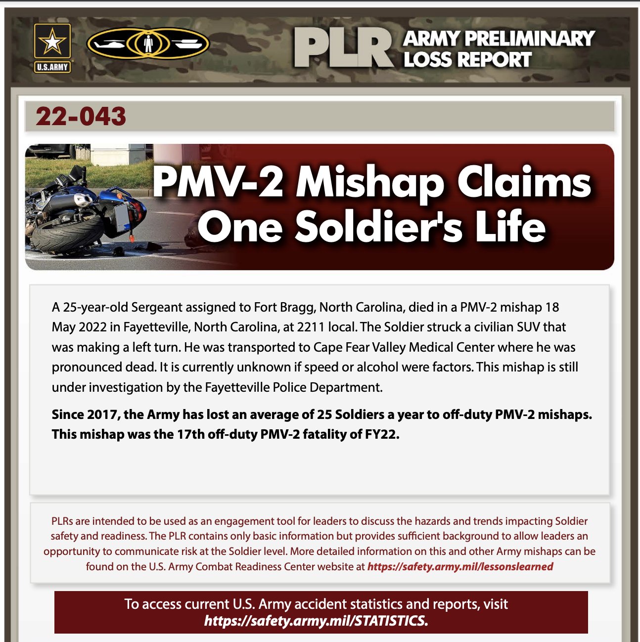 Army Combat Readiness Center On Twitter Plr 22 043 Pmv 2 Mishap Claims One Soldier S Life A 25 Year Old Sgt Assigned To Fort Bragg North Carolina Died In A Pmv 2 Mishap 18 May 2022